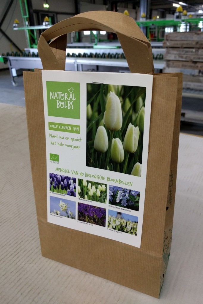 Smukke håndplukkede udvalg af smarte farver. Pakket i en attraktiv gavepose af papir. Disse seje farver (hvid, blå, lilla) blomstrer fra tidligt til sent forår. Dyrkes naturligt, certificeret økologisk. Blandingen af 40 løg indeholder disse sorter: Tulipa Hvid - BIO, Muscari latifolium - BIO, Crocus Barr's Purple - BIO, Narcissus Thalia - BIO, Crocus Flower Record - BIO, Muscari White Magic - BIO.