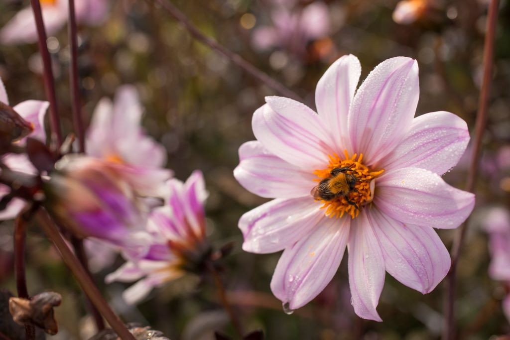 Enkelblommande dahlia i mjukrosa med kontrasterande, mörkt bladverk. Blommorna öppnar bokstavligen sitt hjärta för bina och förser dem med pollen. Naturligt odlade, ekologiskt certifierade. Välj mellan standardpåse med 1 knöl, alternativt ett flerpack.